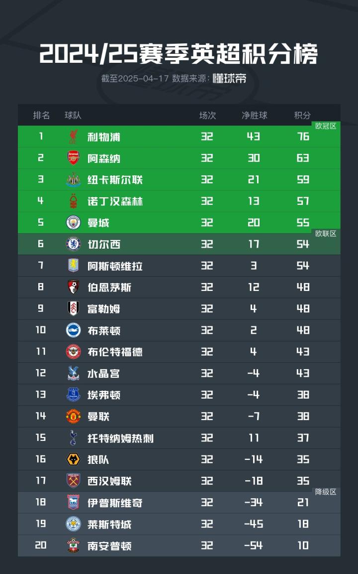 目前的英超积分榜上,纽卡以59分排名第三,诺丁汉森林紧随其后,曼城、切尔西和维拉之间的分差也不大。与此同时,利物浦和阿森纳分列榜首二位,争夺着本赛季的英超冠军。